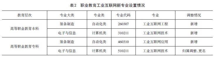 新版專(zhuān)業(yè)目錄設置4個(gè)工業(yè)互聯(lián)網(wǎng)專(zhuān)業(yè),其中高等職業(yè)教育本科新增“工業(yè)互聯(lián)網(wǎng)工程”“工業(yè)互聯(lián)網(wǎng)技術(shù)”專(zhuān)業(yè);高等職業(yè)教育專(zhuān)科新增“工業(yè)互聯(lián)網(wǎng)應用”專(zhuān)業(yè),將“工業(yè)網(wǎng)絡(luò )技術(shù)”歸屬調整(從裝備制造大類(lèi)自動(dòng)化類(lèi)調整至電子與信息大類(lèi)計算機類(lèi))并更名為“工業(yè)互聯(lián)網(wǎng)技術(shù)”(表2)。當前4個(gè)工業(yè)互聯(lián)網(wǎng)新專(zhuān)業(yè),3個(gè)為新增,1個(gè)為專(zhuān)業(yè)調整歸屬并更名,體現工業(yè)互聯(lián)網(wǎng)發(fā)展中工業(yè)網(wǎng)絡(luò )的重要性,并且通過(guò)歸屬調整實(shí)現自動(dòng)化技術(shù)與信息技術(shù)的融合。