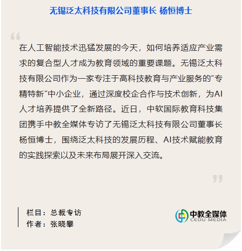全媒體總裁專(zhuān)訪(fǎng) | ?無(wú)錫泛太科技有限公司董事長(cháng)楊恒博士:以AI技術(shù)賦能高科技教育,推動(dòng)產(chǎn)教融合高質(zhì)量發(fā)展